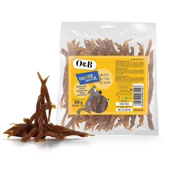 חטיף לכלב 500 גר' רצועות ברווז רכות O&B